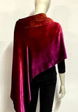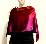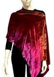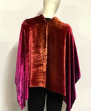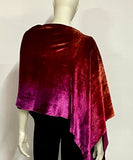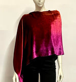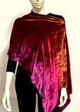 Introducing our luxurious Silk and Rayon Velvet asymmetrical Poncho, a versatile and elegant piece that adds a touch of luxury to any ensemble. This poncho offers two distinct styling options: wear it centered with a cowl front and longer drape in the back, or choose a stylish asymmetrical look with the cowl to one side and the drape to the opposite side. Whether you're looking for a festive accent to enhance your favorite little black dress or a chic addition to jeans and a T-shirt, this poncho is the perfect choice. Hand-ombre dyed in our Denver studio, the rich color palette transitions from burnt orange through scarlet to burgundy, creating a captivating and unique design.