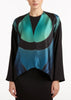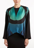 Angle front open jacket with side slits and extended back. Front and back of this jacket are a collage of pieced hand-dyed shibori silk crepe and charmeuse, the jacket is fully lined in silk charmeuse.
