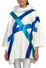 Our Rain Poncho merges technical sophistication with artistic flair. The innovative water-resistant Japanese cotton—treated for superior repellency—drapes effortlessly over your frame with integrated sleeves and a transformative cowl neck that rises into a protective hood when weather demands it. Hand-painted pearlescent ribbons dance across a serene white-and-ocean palette, elevating a practical garment into wearable art.