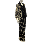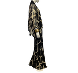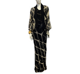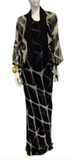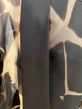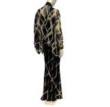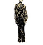 Introducing our stunning ensemble, where multiple shades of black and cream Shibori patterns come together in a mesmerizing play of artistry. The gown is a true masterpiece, featuring layers of sheer fabric that elegantly shift over a lustrous silk charmeuse base, creating a captivating visual effect. Topping off the ensemble is a cropped silk chiffon jacket, adding a touch of ethereal charm and completing the look with sheer perfection. Embrace the harmonious blend of texture, pattern, and sophistication with this enchanting ensemble, designed to make a lasting impression at any special occasion.