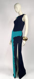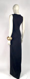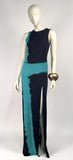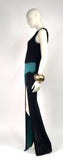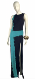 This sleeveless sheath dress features a high round neck and a dramatic high front slit, adding a touch of drama and sophistication. Crafted from luxurious rayon matte jersey, it offers a soft and luxurious feel against the skin. The dress is adorned with an accent of peacock color, beautifully contrasting against the solid black fabric. This one-of-a-kind art-to-wear piece is a true statement of style and individuality. However, if you desire a similar piece in your custom size and accent colorway combination, we can create a unique dress just for you. Embrace the beauty and luxury of rayon matte jersey with this exquisite evening sheath, perfect for making a lasting impression at any special occasion.