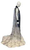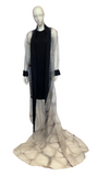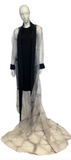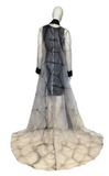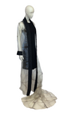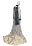 Introducing our breathtaking floor-length coat with a dramatic train, a true statement piece. Crafted from Shibori dyed Japanese glass organza, this coat showcases the artistry of the Shibori process. The pleating from the dyeing technique is expertly heat fused into the surface, resulting in a mesmerizing texture with a subtle iridescence. The coat is elegantly trimmed with black Japanese eyelash cotton, adding a touch of contrast and sophistication. Prepare to make a grand entrance with this extraordinary coat that effortlessly blends artistry and fashion.