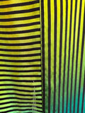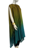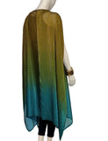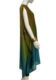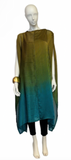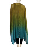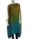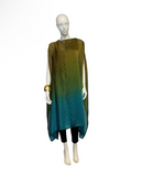 Flowing Caftan can be worn two ways, for varying coverage… Arm can extend through shoulder opening, or for more coverage hand can come through side seam opening. Long side slits. Shimmering Japanese rayon/nylon burnout satin. Ombré dyed in house. Tourmaline.