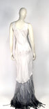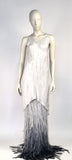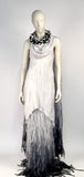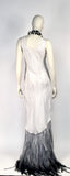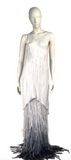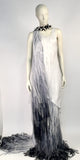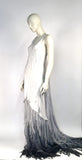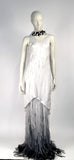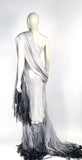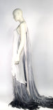 Subtle silver to charcoal shibori flows down this layered white silk double-georgette gown and wrap. Emerging from the underlayer is a fringe, made of hundreds of yards of hand ombre dyed silk organza bias ribbon. The slightest movement or breeze creates a sublime fluttering at the base of the gown, and along the lower portions of the floor length wrap. This is a one-of-a-kind piece of art-to-wear, the third and final piece in the “fringe gown” series. 100% silk georgette & organza.