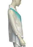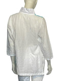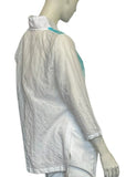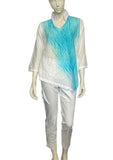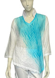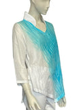 Our perennial best seller, updated. Slim cut tunic with v-neck and stand up collar, narrow 3/4 sleeves, slide slits, and asymmetrical front. Buttery soft pebbled texture Japanese cotton. White, with turquoise shibori dye pattern.
