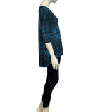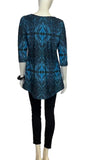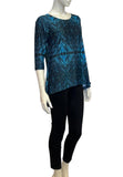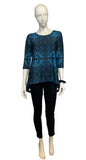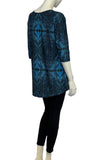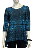 Introducing our Slightly Flared T-Shirt, a versatile and stylish addition to your wardrobe. This t-shirt features a flattering silhouette with a slight flare, enhancing your natural curves. The three-quarter sleeves provide a touch of coverage and comfort. The standout feature is the digital print of Shibori fabric, creating a unique and eye-catching design. Crafted from a poly/spandex blend, the t-shirt offers a soft and stretchy fit, ensuring all-day comfort. The shaped hemline adds an extra touch of style and sophistication. Whether paired with jeans for a casual look or dressed up with a skirt, this t-shirt is a perfect choice for any occasion.