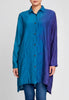 Our new Ellen Blouse features front patch pockets and an asymmetrical hemline, with a narrow stand-collar atop a long sleeve button front top. The fabric is a lustrous, textured Japanese cotton, hand dyed in a glowing ocean ombre colorway.