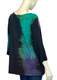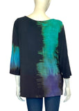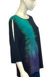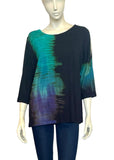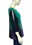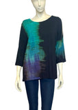 The Olivia Tee features a slight a-line silhouette, shaped hemline, and a "cold shoulder" slit on the top of the 3/4 sleeves… With a striped Shibori pattern in ocean blue .