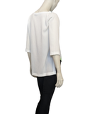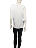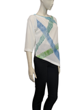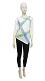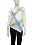 Our perennial best seller, updated. Slim cut tunic with wide neck, narrow 3/4 sleeves, slide slits, and asymmetrical front. Buttery soft ripple Japanese poly. Black or White, with drybrush painted stripes in: silver, ocean, tourmaline, or mango.