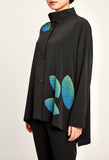 Square cut blouse, with stand up collar and side slits. Buttery soft rippled Japanese poly, with hand painted leaf motif, Black with blue leaves.