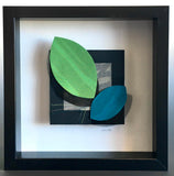 Experience the captivating beauty of our Hand Shibori dyed, fused, and stitched silk collage—a testament to artistic mastery. Delicate layers of transparent silk organza imbue the artwork with a mesmerizing effect, as dyed Shibori leaves appear to gracefully hover above the central 5"x5" panel. Framed in a sleek 10"x10" black shadow box, this piece exudes elegance and sophistication. Whether showcased individually or curated in a captivating group, it adds a touch of enchantment to any space. Indulge in the exquisite allure of this unique art form today.