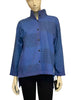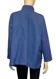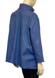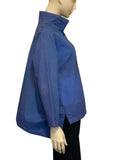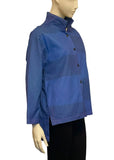 Button front blouse is straight cut in front with trapeze back and stand-up collar. Japanese Cotton “Micro Pinwheel” Houndstooth weave shifts with Shibori color Stripping. Staggered Stripes Shibori Pattern in cream on Black/ White Fabric. Also Available overdyed in: Turquoise, Purple, Mango, Chartreuse, Indigo